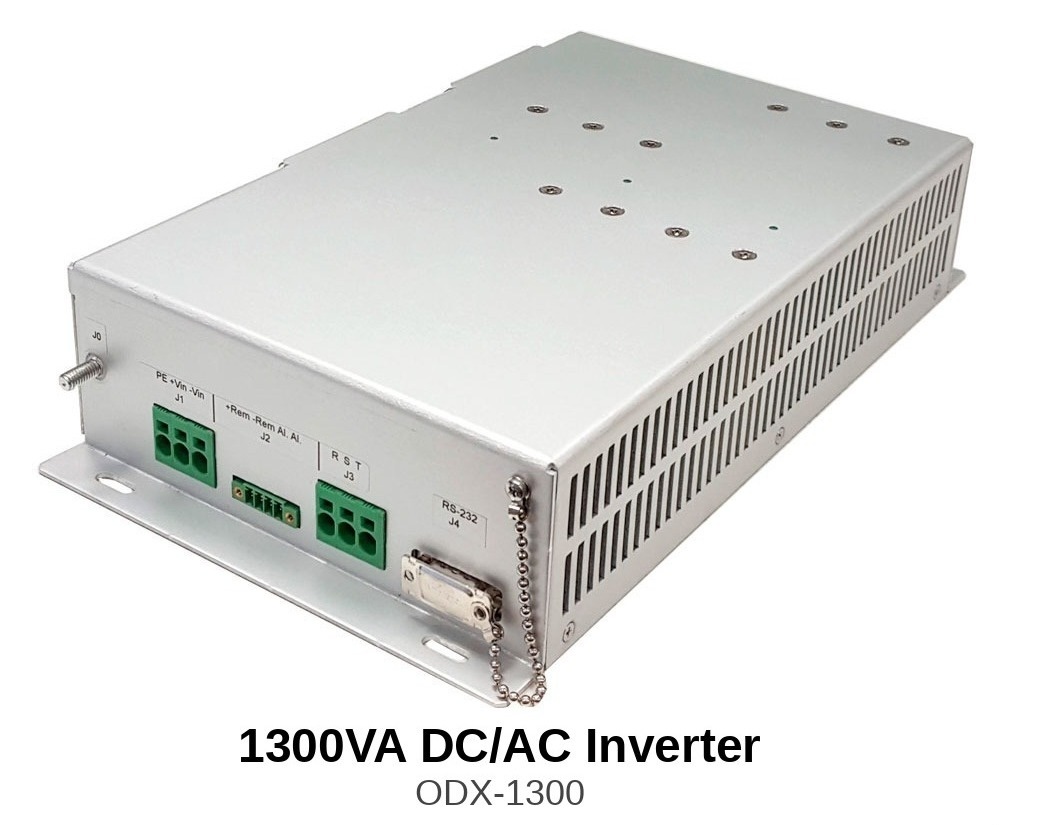 The ODX-1300 is a three-phase sinusoidal DC/AC inverter rated 1300 VA with multiple input-output voltage combinations. It accepts 24, 72, or 110 Vdc and provides 250 or 400 Vac three-phase output, supporting motor control and auxiliary three-phase loads. Compliant with EN50155 and EN45545-2.